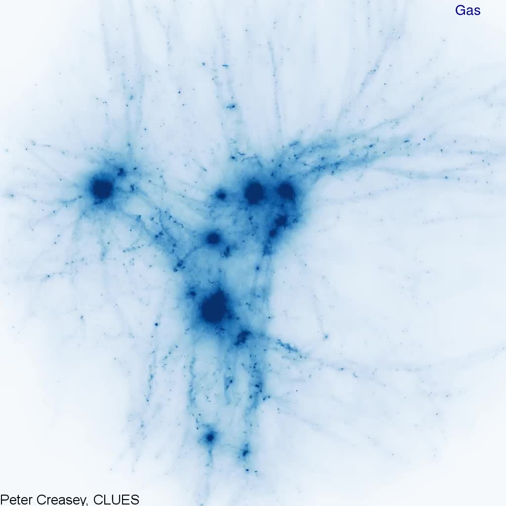 ![]() | Animation of the gas, stellar and dark matter density within a zoom simulation of the Local Group and surroundings within 10 Mpc at the present time. The stellar mass is concentrated in the centres of dark matter halos, whilst the gas is visibly forming filamentary structures. Also see this article: Creasey et al. 2015.Credit: Peter Creasey, Cecilia Scannapieco, the CLUES teamMovie [mp4, 9.5 MB] Snapshot [jpg, 50 KB] |