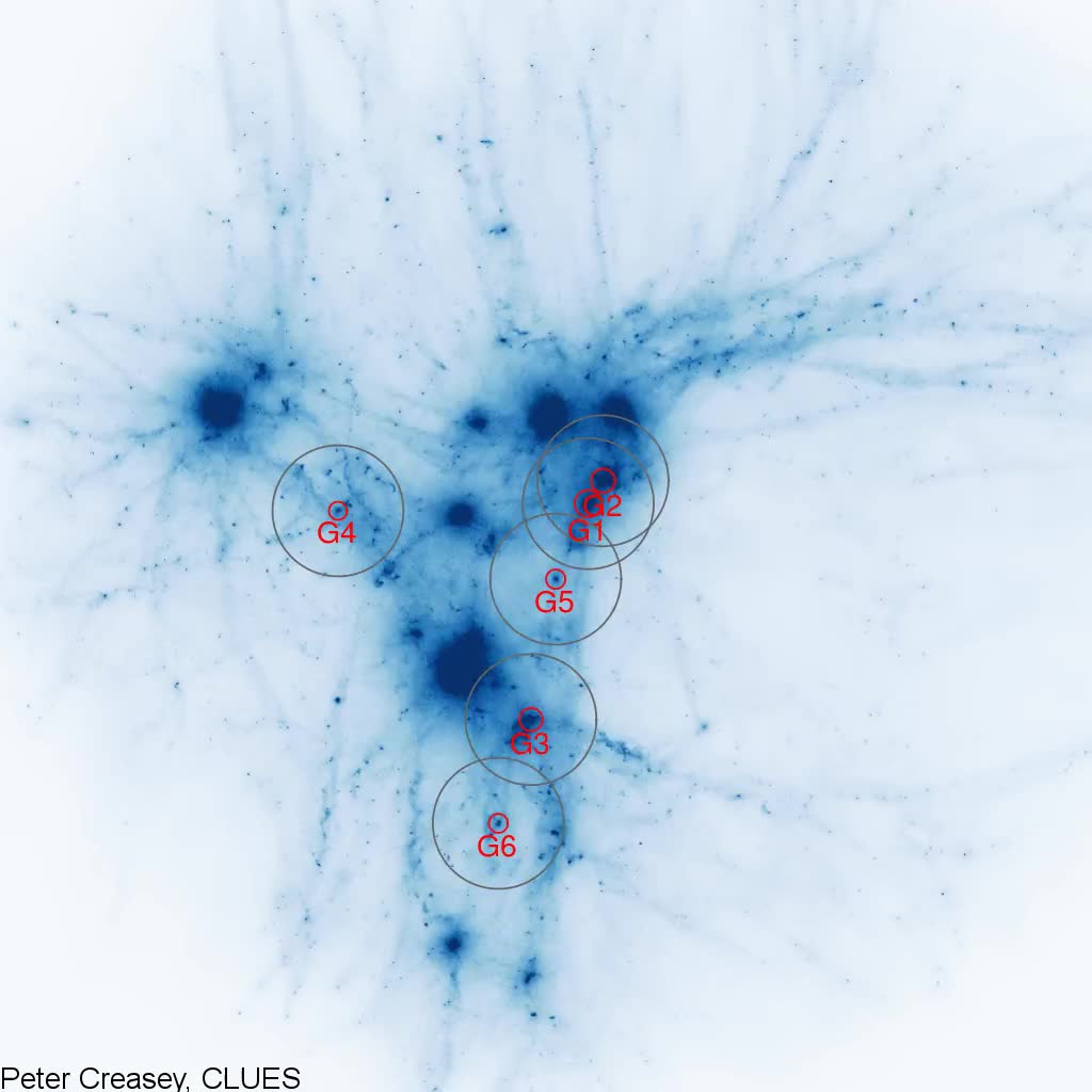 ![]() | Animation of the gas density within a zoom simulation of the Local Group and surroundings within 10 Mpc at the present time. The candidates for Andromeda and the Milky Way (G1 and G2 respectively) are identified, along with 4 other galaxies of similar stellar mass. Red circles mark the virial radii and grey circles mark the 1.2 Mpc environment of each galaxy. Also see this article: Creasey et al. 2015.Credit: Peter Creasey, Cecilia Scannapieco, the CLUES teamMovie [mp4, 9.5 MB] Snapshot [jpg, 50 KB] |