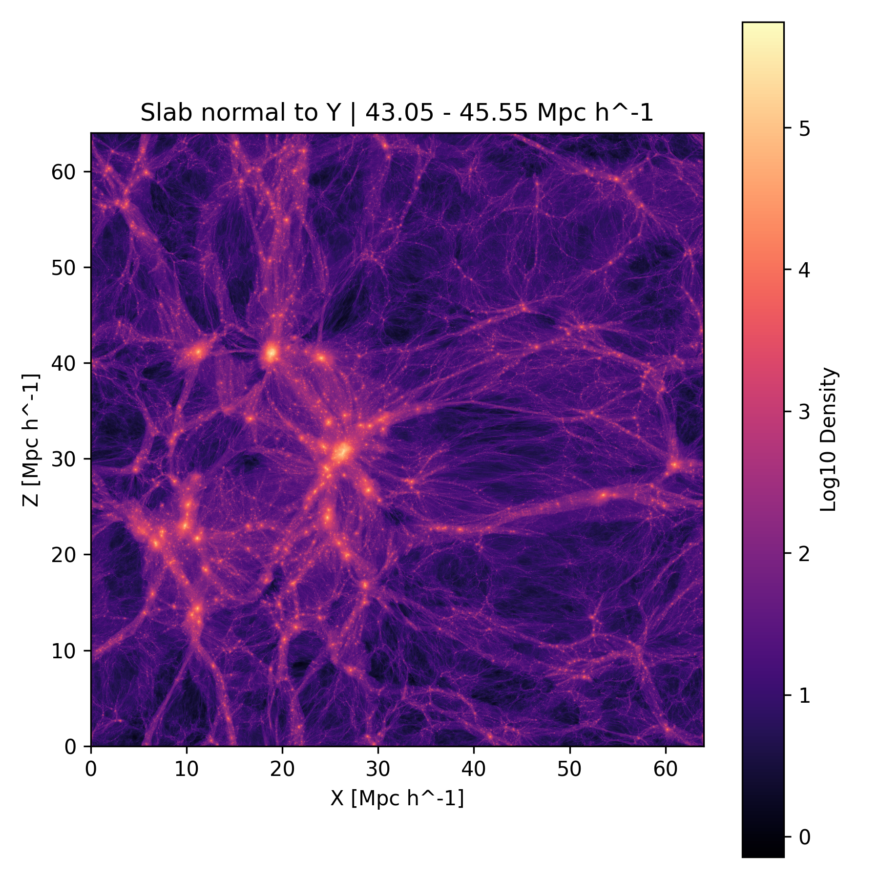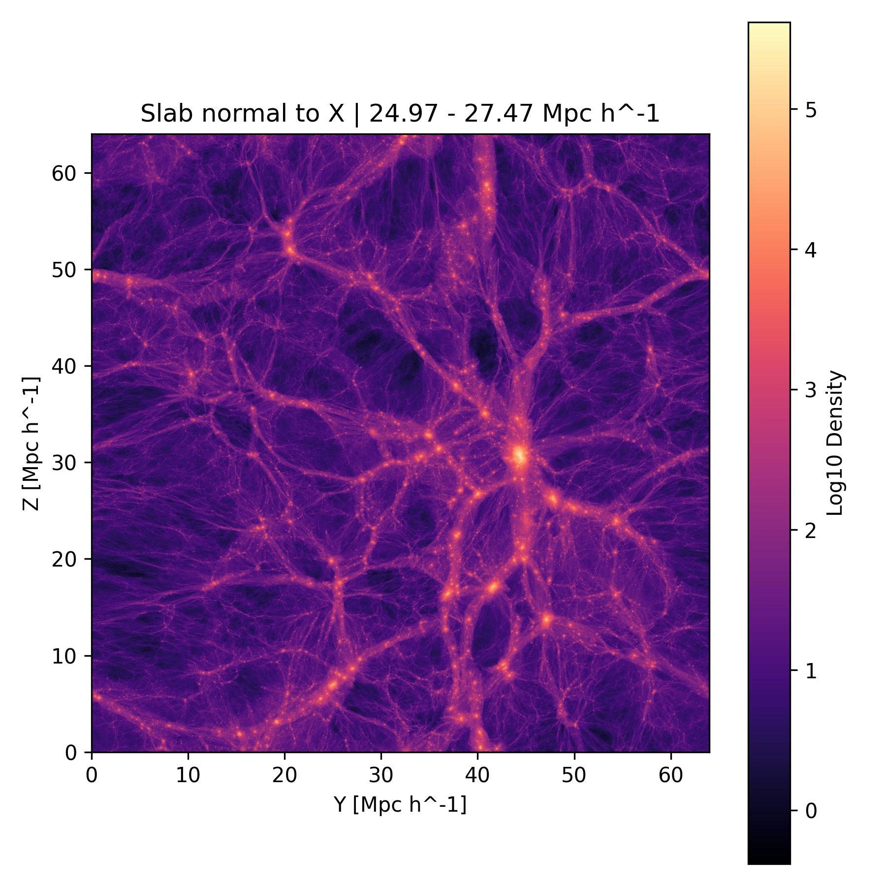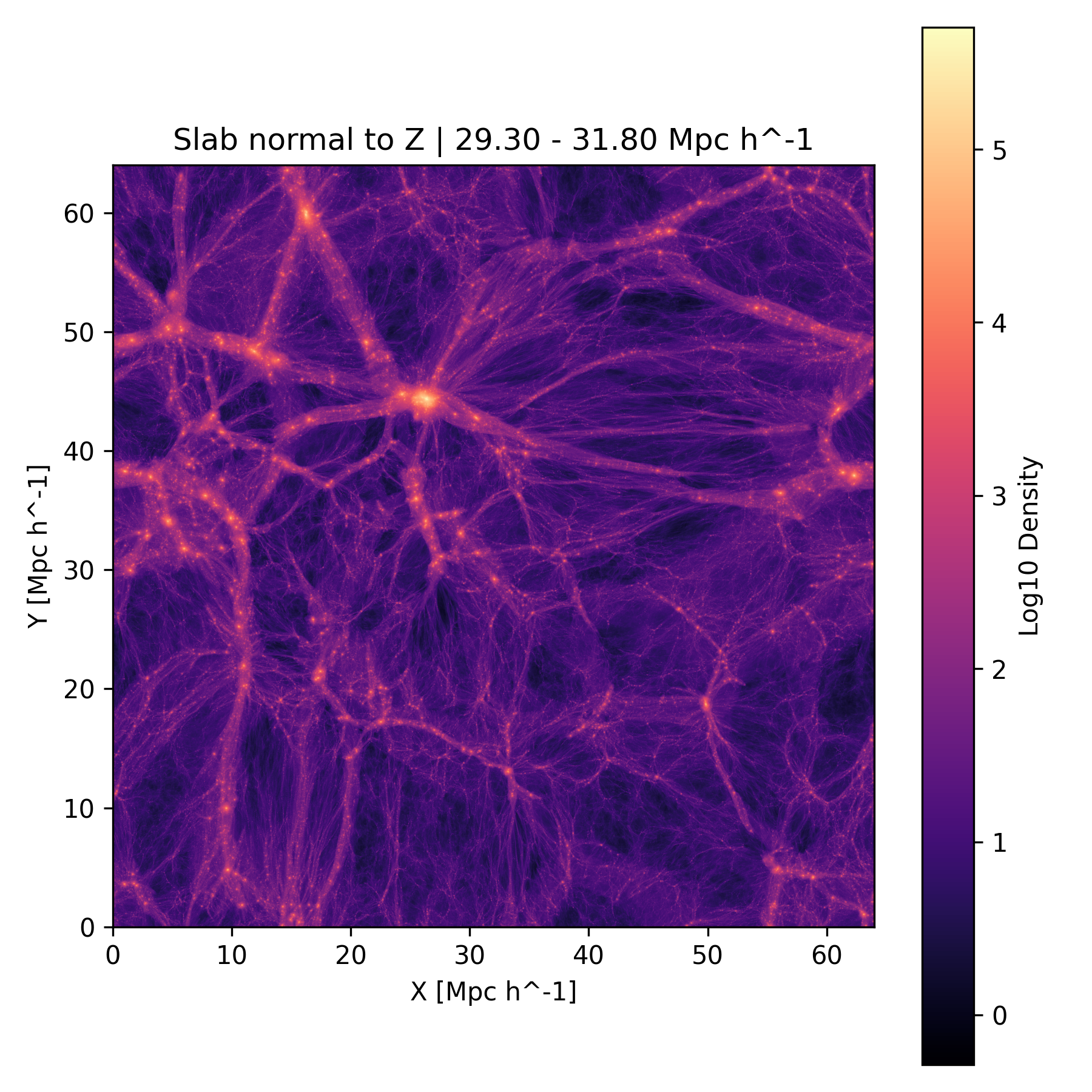 The three plots below show slices through the simulation centered at the position of the simulated Virgo cluster (26.2 Mpc/h, 44.3 Mpc/h, 30.7 Mpc/h in box coordinates).