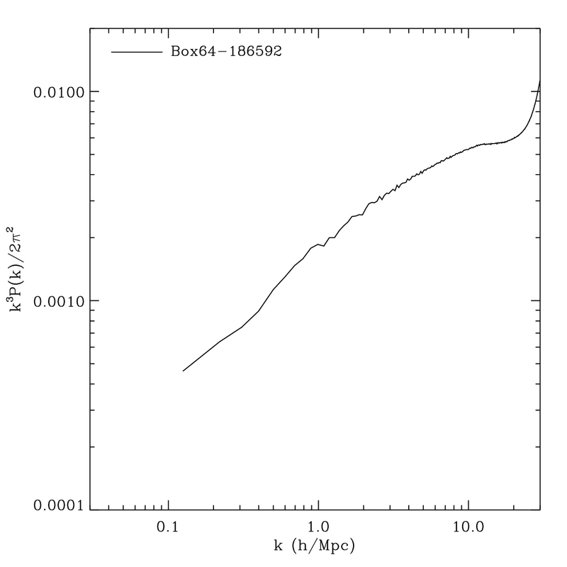| spectrum | EisHu approximation (image of a spectrum calculated from the simulation at starting redshift z=50, with 256^3 particles: jpg [50 KB], eps [20 KB]) |